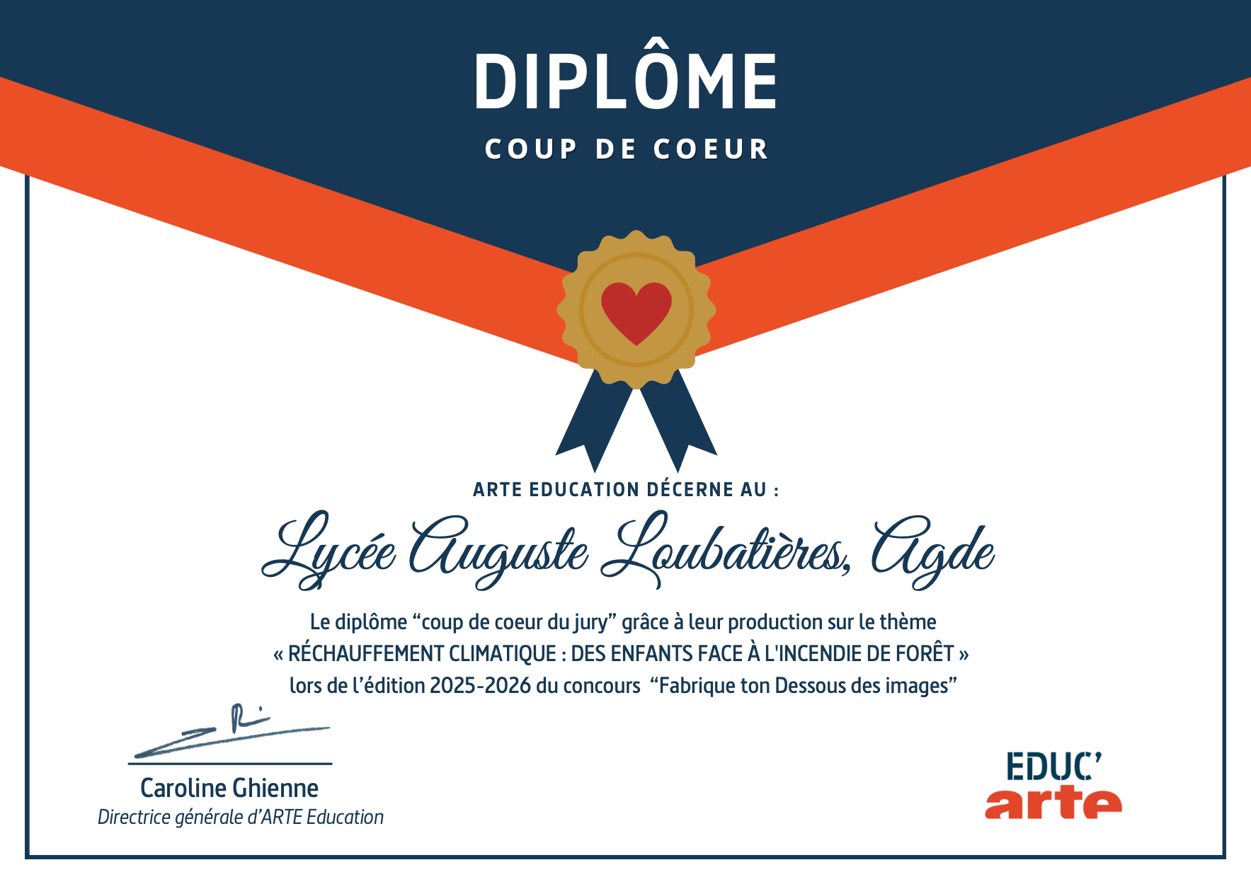 Primée dans « les Coups de Cœur d’Arte », grâce à la production sur le thème du « RÉCHAUFFEMENT CLIMATIQUE : DES ENFANTS FACE À L'INCENDIE DE FORÊT » cette distinction vient saluer la qualité du travail réalisé par les élèves de la 1ST2S2 et plus particulièrement, Maeliss MENGUY , Manon RAYNAUD et Sara ZORINO , leur esprit d’équipe et leur implication tout au long du projet.